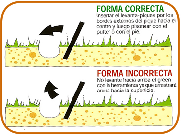 Las marcas de piques en el green deben ser reparadas rápida y correctamente para que el daño sea mínimo. Al reparar un pique dentro de cinco minutos, un green se recupera dentro de 24 horas. Sin embargo, si se repara a los diez minutos, el green tomará varios días en recuperarse. |